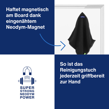 Zur schnellen, rückstandsfreien und oberflächenschonenden Trocken- und Feuchtreinigung. Mit eingenähtem Neodym-Magneten: Haftet an allen Whiteboards und magnetoplanâ Glasboards sowie weiteren, eisenhaltigen Oberflächen.